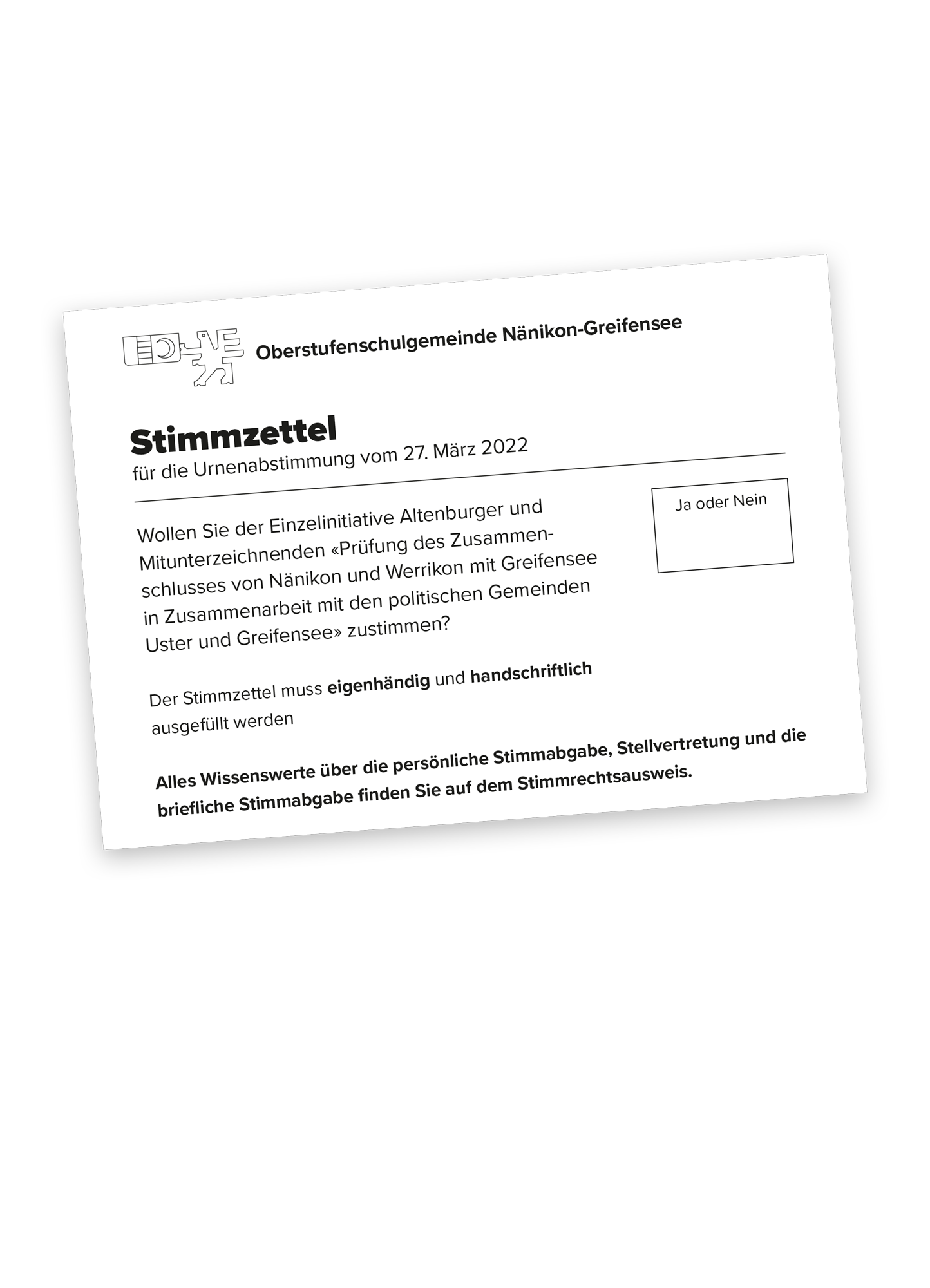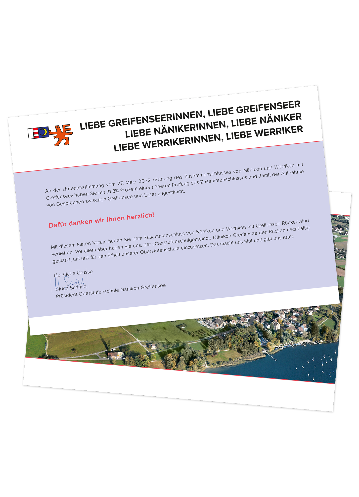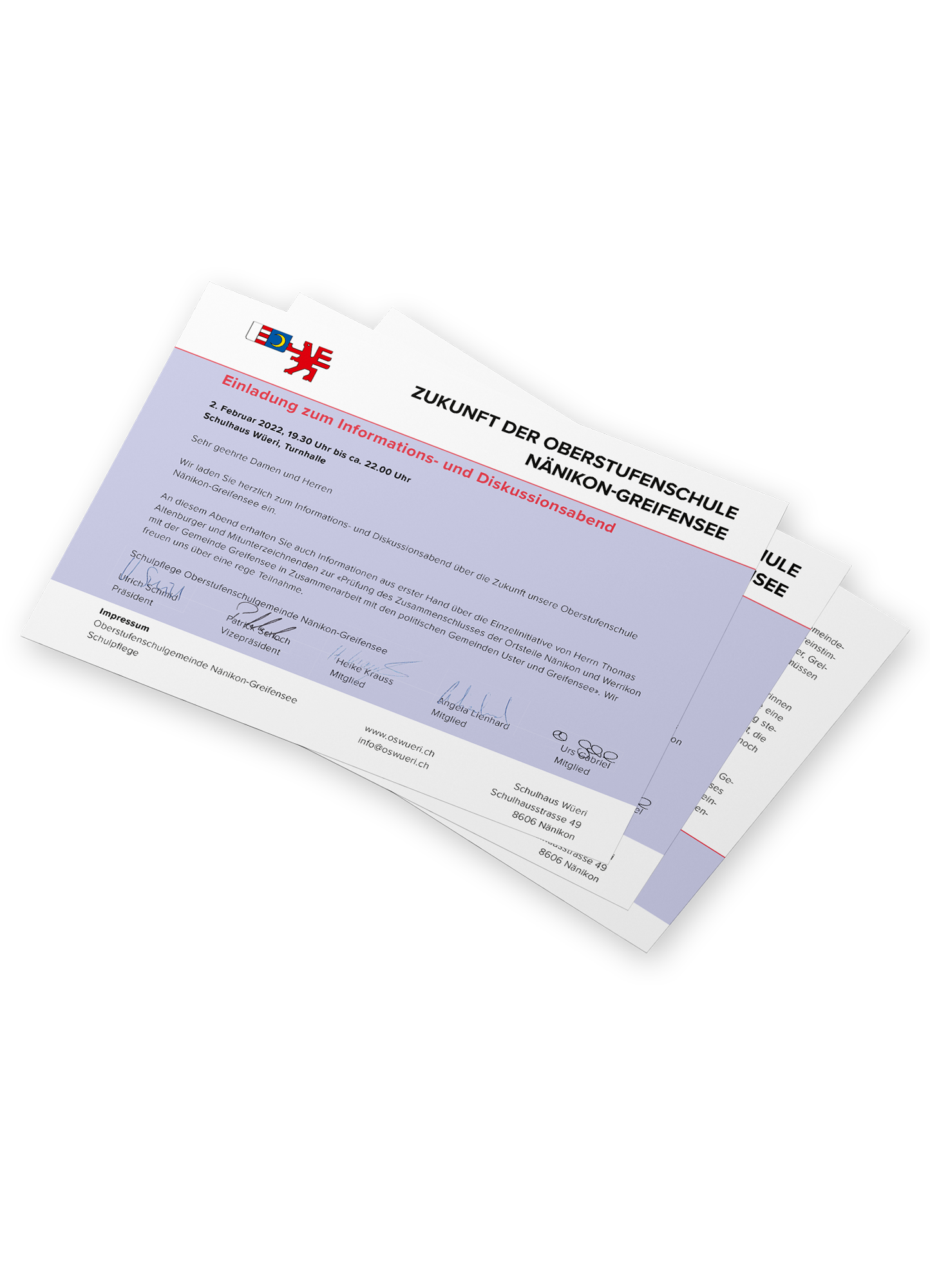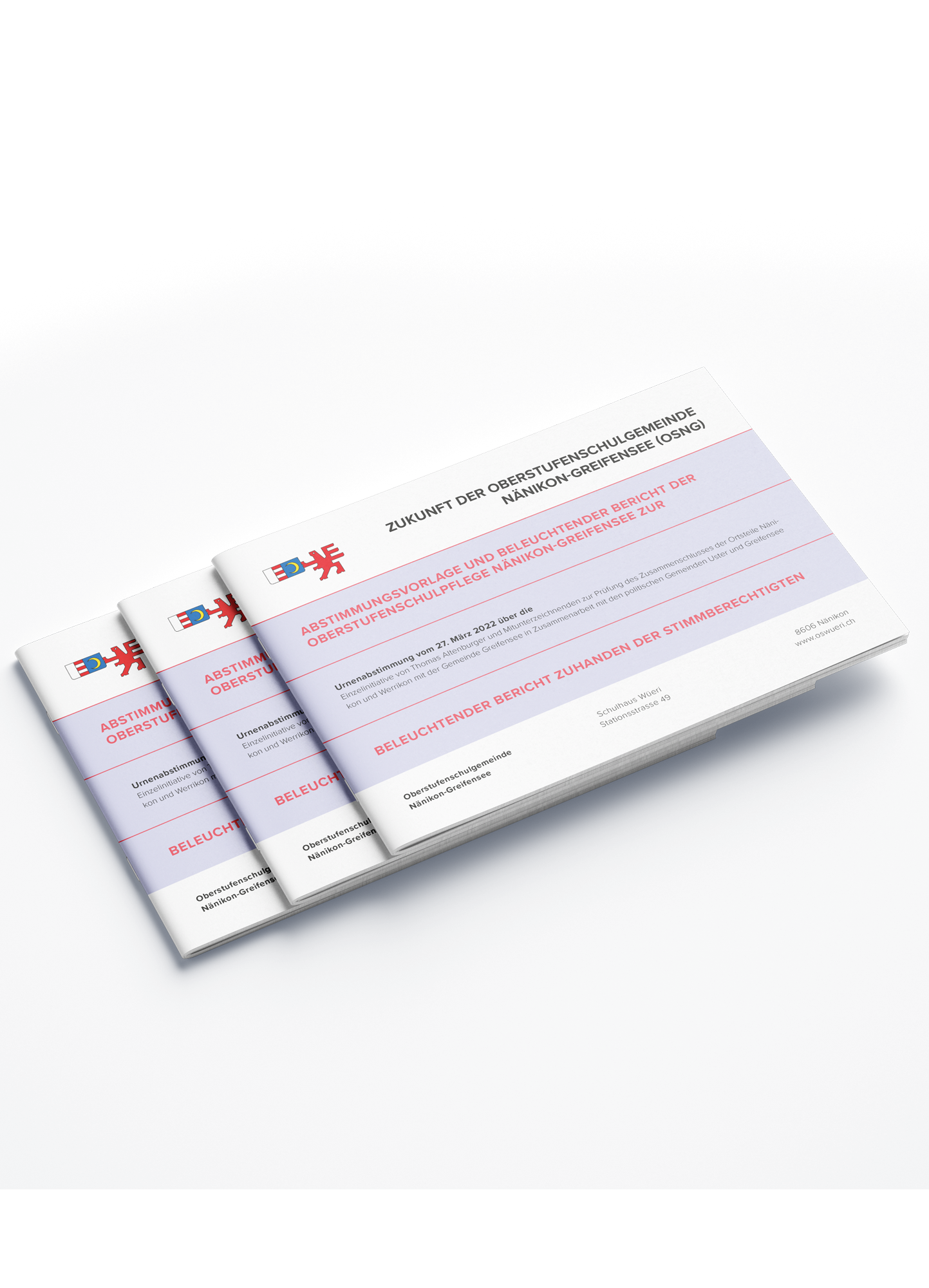 Die Oberstufenschule Nänikon-Greifensee entspricht nicht mehr den aktuellen gesetzlichen Anforderungen. Die Optionen sind entweder die Schließung oder eine Integration mit der Schule in Uster, was man jedoch zu vermeiden versucht. Um die Präferenzen der Bevölkerung zu erkunden, fand eine Abstimmung zur Zukunft der Schule statt. Zur Information über diese Abstimmung und das Anliegen hat das Initiativkomitee Galliker Design beauftragt, diverse Unterlagen einheitlich zu gestalten, angelehnt an das Corporate Design der Oberstufenschule Nänikon-Greifensee.
